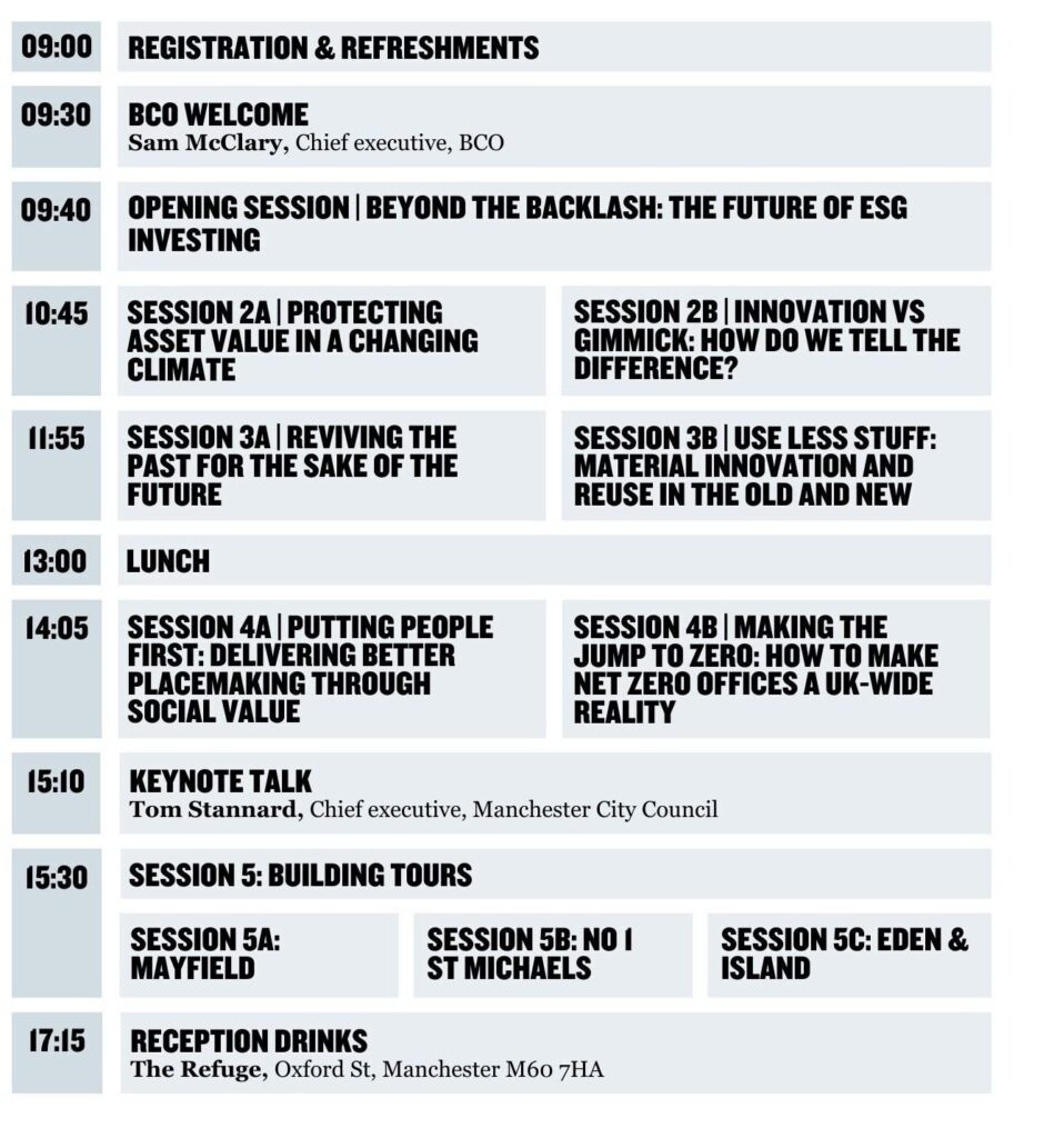 The Summit will open with a BCO welcome and panel discussion exploring the future of ESG investing. Delegates will then attend three of six concurrent panel sessions, followed by curated building tours