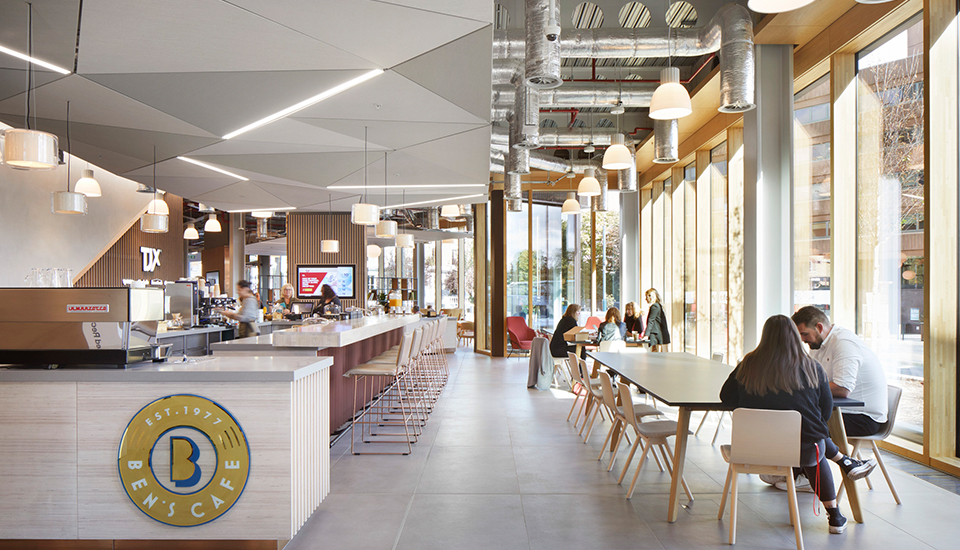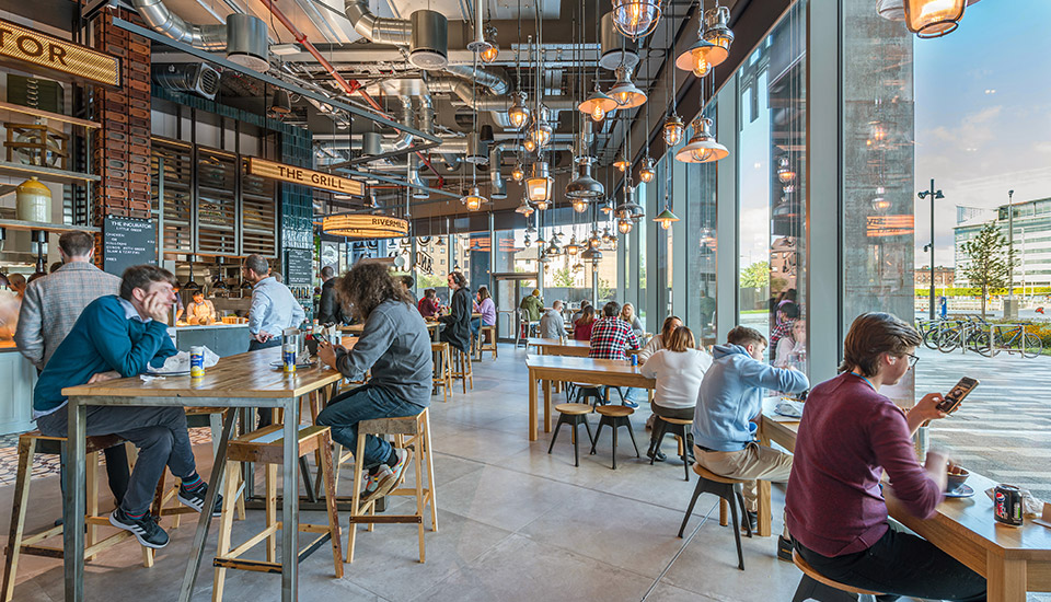 Further amenities on campus include community exhibition spaces, wellbeing facilities, and a street food market offering fresh and healthy food options, considered important to today’s workforce.