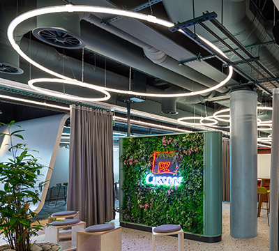 Rather than creating a corporate citadel, the Barclays Glasgow Campus is a mixed-use ecosystem that spurs originality and produces new synergies. Biophilia fills the cafeteria area, while staff swings are in one of the offices.